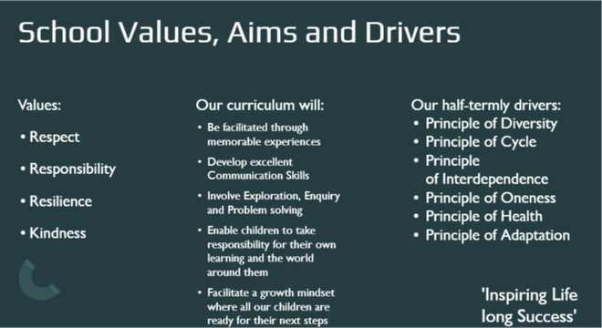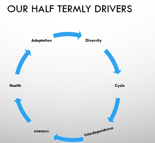 Through each topic, our curriculum aims (in green above) will be at its core and every half term, children will have a driver where all content will flow throughout the half term. Through these drivers, children will develop a deeper knowledge about the world around them and what their responsibility is within it.